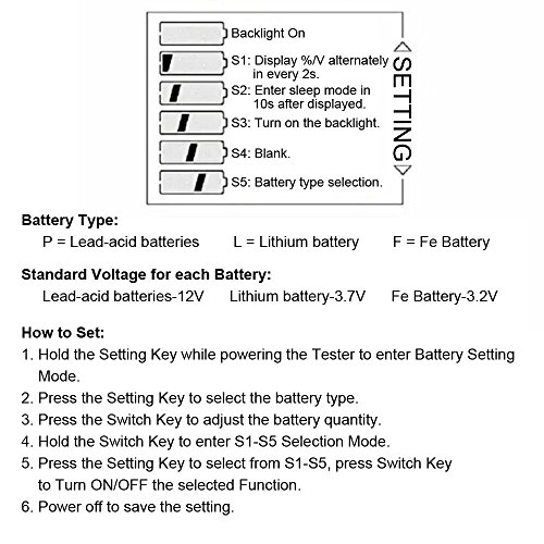 Pvc-waterdichte schermbescherming: waterdicht bovendeel met twee knopen. De functietoets is voor het schakelen van capaciteit, spanning en uitschakelen. Selecteer om de spanning, de batterijcapaciteitspercentage alleen weer te geven of de reeks door op de functietoets. De instelknop is voor voorgeselecteerde batterijspecificaties, enz.