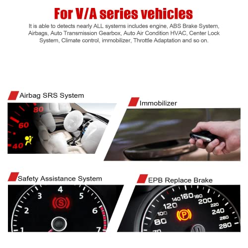 Voor de diagnose van Volkswagen (VAG) -voertuigen kan het apparaat niet alleen codes lezen en wissen op motor, ABS, transmissie, SAS (niet alle auto’s), ESP, TPMS en andere systemen, maar ook de aanpassing van de olie, remblokken en gasklepstand resetten .