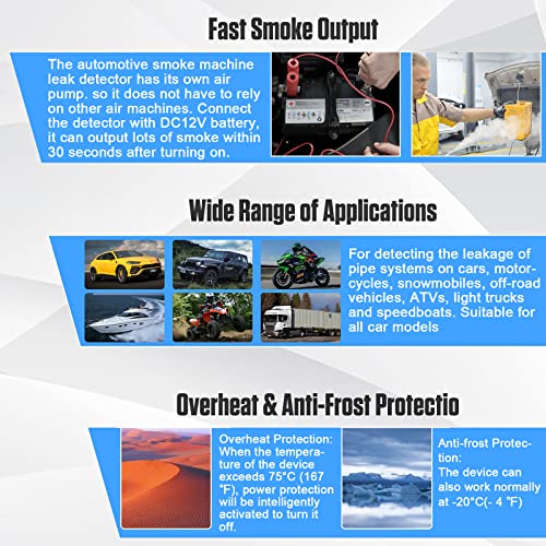 GEMAKKELIJK TE GEBRUIKEN: De SDT-106 Rookmachine met gebruiksvriendelijke functie en draagbaar ontwerp kan monteurs helpen om binnen 30S veel rook te produceren om de lekken in het leidingsysteem op te sporen (door babyolie op te warmen). De diagnostische tijd drastisch verkort.