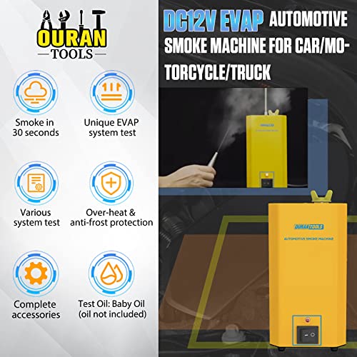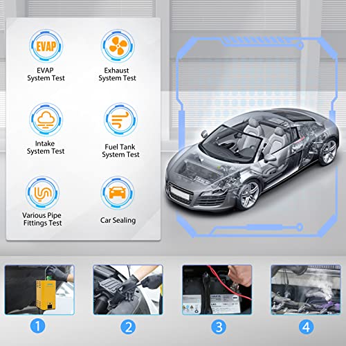 ONDERSTEUND EVAP-SYSTEEM: EVAP is een controlesysteem voor brandstofverdamping dat wordt gebruikt om brandstofdamp te verzamelen en ermee om te gaan, om lekkage van brandstofdamp te voorkomen. Energiebesparing en milieubescherming. Wordt geleverd met een speciale EVAP-connector, het kan u helpen bij het toepassen van het EVAP-systeem van alle voertuigen om de lekken te detecteren.