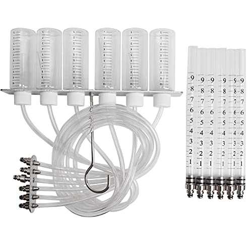 Bevat 6 glazen kolven, 6 maatbekers elk met 70 cm aansluitslang, gemonteerd op aluminium lijst met haken.