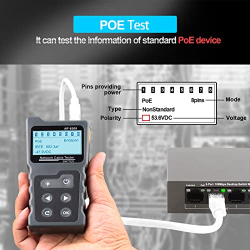 Specification: KOLSOL Netwerkkabeltester, netwerkkabel-tracker voor Cat5/Cat6, NF-8209 PoE-tester met NVC/LCD-LAN-kabel