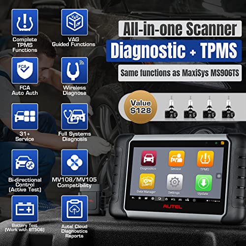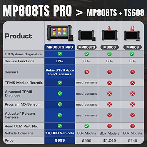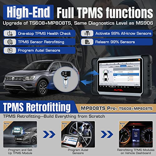 🥇【2022 NIEUWSTE MODEL + €120 4PCS 2-IN1 SENSOREN】Upgrade van MP808TS, Autel MaxiPRO MP808TS Pro uitgerust met €120 4pcs 2in1 Sensoren🎁, wat gelijk is aan MP808+TS608+4pcs Sensoren. Als combinatie van MS906 MP808BT MP808K MP808 DS808K DS808 TS608 TS601 TS508, verzamelt Autel MP808TS Pro volledige TPMS-Functies (TS608 Niveau), Bidirectionele Besturing, Alle Systeemdiagnostiek (MS906 Niveau), ECU-Codering, Actuatortest, 31+ Service enz. voor Professionele Monteurs en Grote Werkplaatsen.