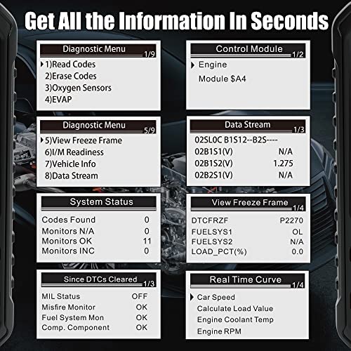 ✅【Multifunctioneel】 – Praktische multi-Functies OBD2-codelezer beschikt over ingebouwde OBD2 DTC-lookupbibliotheek, die je helpt om de oorzaak van het motorlicht te bepalen, code te wissen, vriesframe te wissen, I/M klaar, voertuiginformatie, gegevensstroom, real-time curve, voertuigsnelheidsinformatie te krijgen, belastingswaarde te berekenen, motorkoelvloeistoftemperatuur, motorsnelheid te krijgen.
