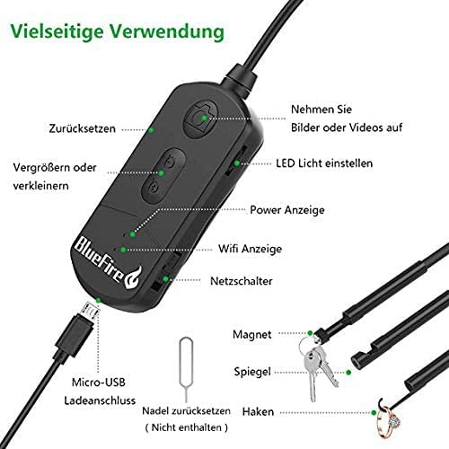 Specificaties: Lengte: 1,5 m Camera-diameter: 5,5 mm Sensor: 2,0 megapixel CMOS-resolutie: 1920 x 1080, 1280 x 720, 640 x 480 Kijkhoek: 60° LED-licht: 6 stuks instelbaar Brandbreedte: 3 cm – 10 cm (dat is 1 – 4 inch) boven 4 inch Verzamelingsbereik: binnen 15 m werktijd: ongeveer 5-6 uur voor volledig opladen Stroombron: 1800 mA ingebouwde batterij Voeding voor opladen: DC 5V Ondersteunt foto’s opnemen: Fotoformaat: JPEG Video Video Opname: Videoformaat: AVI Ondersteuningssysteem: Android 4.4 / IOS (via IOS6) Pakket: 1BlueFire Draadloze endoscoop, 1 x USB-naar-micro-USB-oplaadkabel, 1 x zijspiegel, 1 x haak, 1 x magneet, 1 x handleiding (mogelijk niet beschikbaar in het Nederlands)