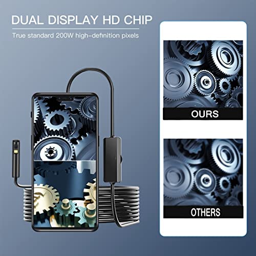 Dual-lens camera kan wisselen tussen verschillende kijkhoeken als dat nodig is zonder zijspiegel te installeren. Door de dubbele kijkhoek van 70° heeft de endoscoop een grotere kijkhoek bij het betreden van een smalle plaats.
