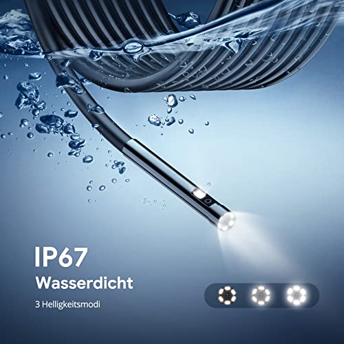 Afneembare 5 m kabel en 7 leds: de 5 m lange halfstijve materiaalkabel kan gemakkelijk worden verwijderd en gemakkelijk worden opgeborgen. Met 6 instelbare ledlampen van de hoofdcamera en 1 van de zijcamera kan deze inspectiecamera 3 helderheidsmodi aanpassen. Dit maakt scherpe foto’s mogelijk, zelfs in zwak verlichte hoeken.