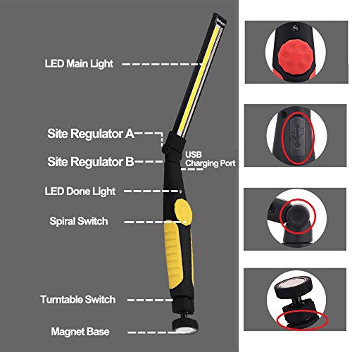 Eenvoudig te bedienen: draai de werklamp naar rechts, stel de helderheid van de lamp in. De sterke magneten kunnen het werklicht op een ijzeren metalen oppervlak, zoals auto, vrachtwagen, machine houden als ze werken of repareren. Het middendeel kan 120 graden worden opgevouwen en ingesteld.