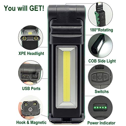 ✅ 2 USB-poorten – Eén poort voor opladen via USB en een andere poort voor stroomuitvoer. Ingebouwde 18650 oplaadbare batterij, USB-kabel inbegrepen, deze led-werklamp wordt snel opgeladen en wordt langer gebruikt.