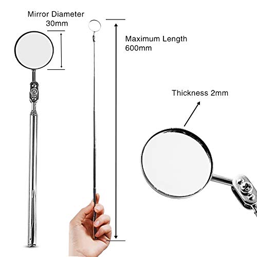 【Retractable Telescopic Mirror】: The telescopic mirror shaft can can be adjusted and the maximum length up to 23.6in/ 600mm, and is very thin so you can use it in many different situations. Easily extends into tight areas to search for lost or dropped items and perform inspections, and clear glass mirror for perfect reflection