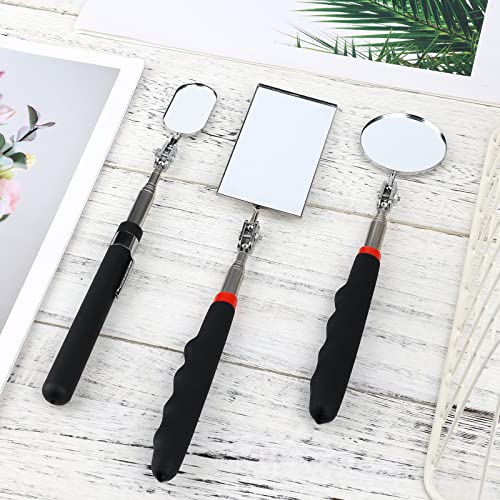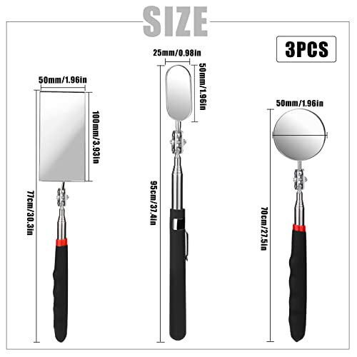 Inhoud van de verpakking: u ontvangt 3PCS-telescopische inspectiespiegels in 3 maten / vorm, meten van het plein: spiegelgrootte: 10x5cm, verlengde maat: 77cm, ronde: spiegelgrootte: diameter 5cm, uitbreiding van de grootte: 70cm en ovale vorm: spiegelgrootte: spiegelgrootte:5×2,5cm, uitbreidingsafmetingen: 95cm.