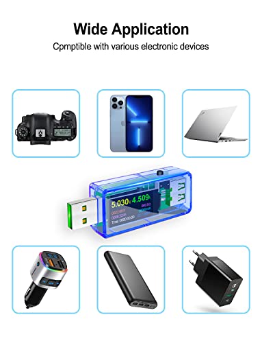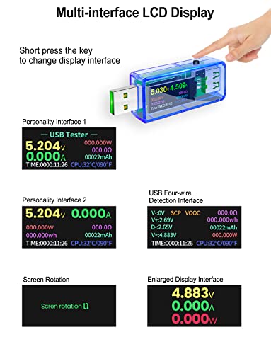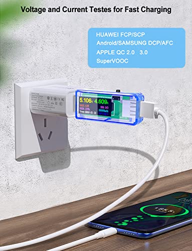 Brede toepasbaarheid: Deze USB Tester Meetspanning: 3,7V-30V; meetstroom: 0-4A. Ondersteunt QC2.0, QC3.0, iPhone 2.4A/2.1A/1A/0.5A, Android DCP/AFC, FCP (9V/2A) /SCP (4.5V/5A), snelle oplaadprotocol identificatie, laat u de laadstatus van de telefoon weten. Ondersteuning voor hoge stroom testen, ondersteuning USB3.0 interface mobiele harde schijf en U-schijf test.