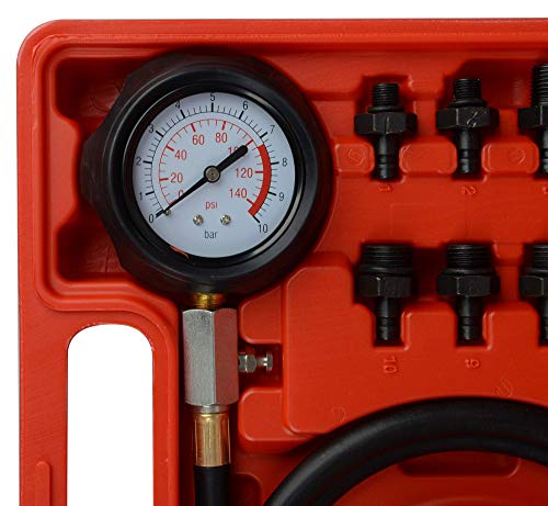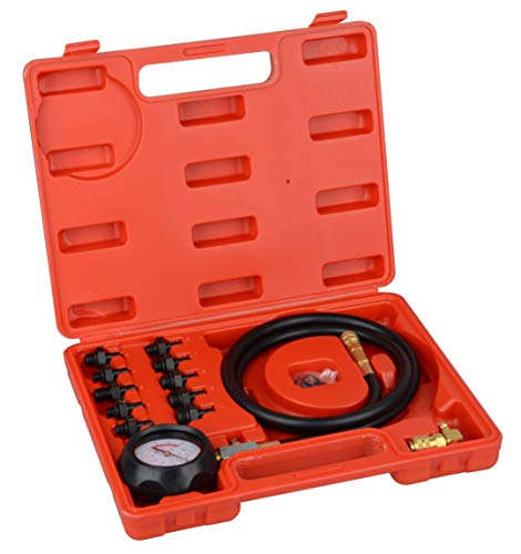 Dit is een hoogwaardige professionele motor- en oliedruktestset. Het wordt gebruikt om versleten oliepompen en motoren te diagnosticeren, defecte oliedrukschakelaars en drukwaarschuwingsindicatoren. Het heeft een schokbestendige dubbele schaal meter voor een snelle en nauwkeurige oliedrukcontrole. Ook heeft het snelkoppelingsadapters met een ingebouwde afsluitklep. De flexibele slang stelt gebruikers in staat om toegang te hebben tot moeilijk bereikbare olieschakelaarpoorten.