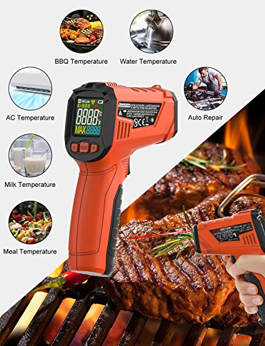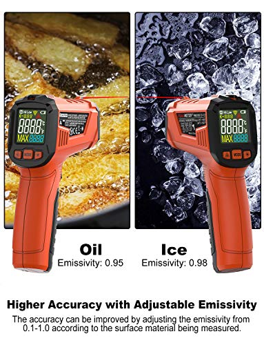【VERSTELBARE EMISSIVITEIT】 Instelbaar 0,85 tot 0,98 (0,95 preset) Contactloze lasermeting en K-sonde contactmeting voor nauwkeurigere metingen. U kunt de emissiviteit instellen afhankelijk van het materiaal. Ter referentie hebben we een specifieke emissiviteitstabel bij de handleiding gevoegd.