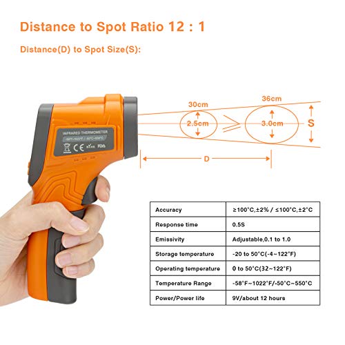 🔥【Nauwkeurige Resultaten 】 De afstand van de plek Verhouding is 12:1 en de ingebouwde laser helpt om de exacte plaats van het object te positioneren, het bevordert de meet precisie. Nauwkeurigheid: 2% of 2℃. De beste nauwkeurigheid wordt bereikt met een afstand van ongeveer 20 cm (7,87 inch) tussen de thermometer en het object.