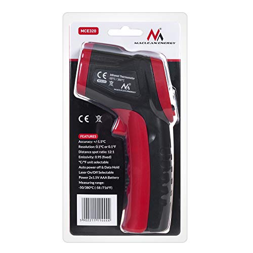 Specification: Maclean MCE320 Contactloze infrarood thermometer IR pyrometer digitaal temperatuurpistool -50 tot +380 °C rood/zwart